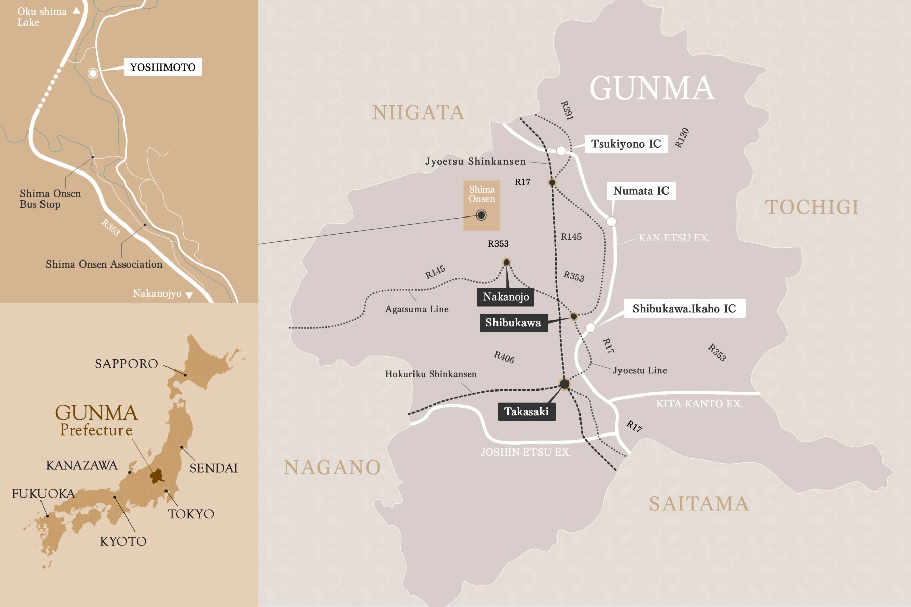Nerima IC/Kan’etsu expressway → Shibukawa Ikaho IC → Route 353 → Yoshimoto