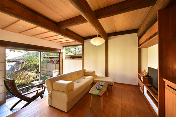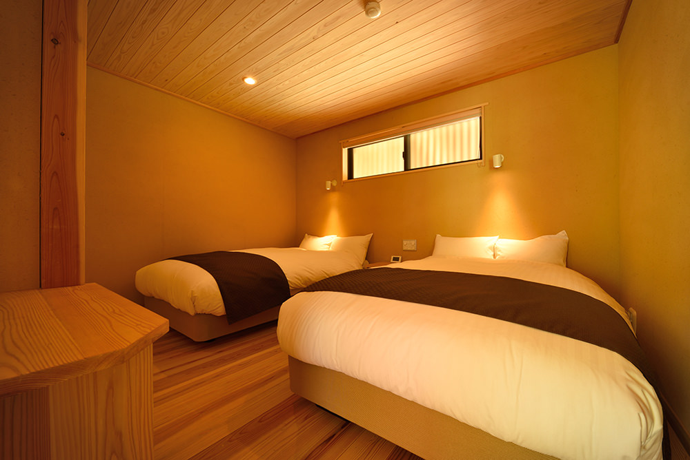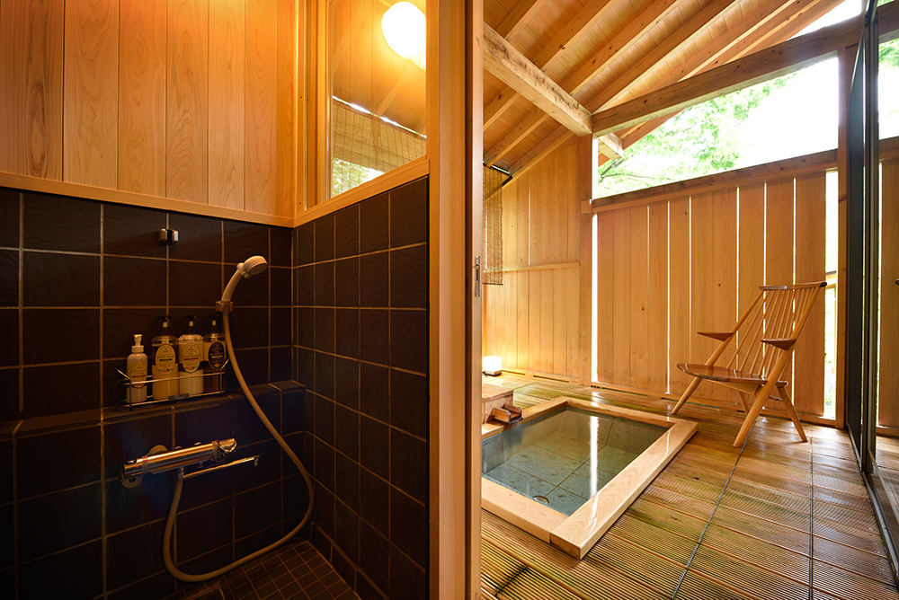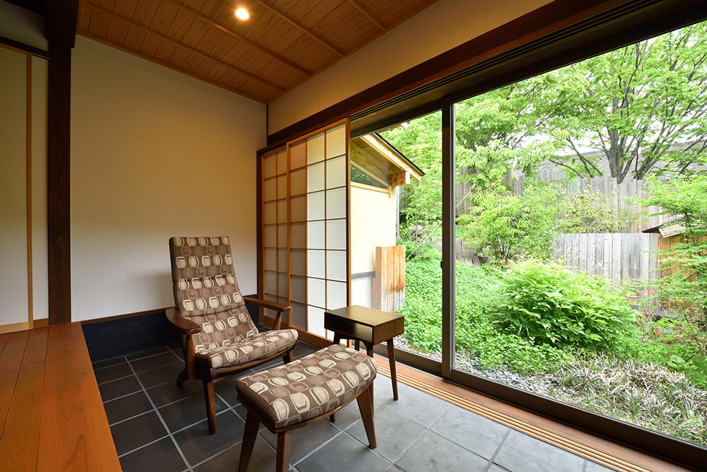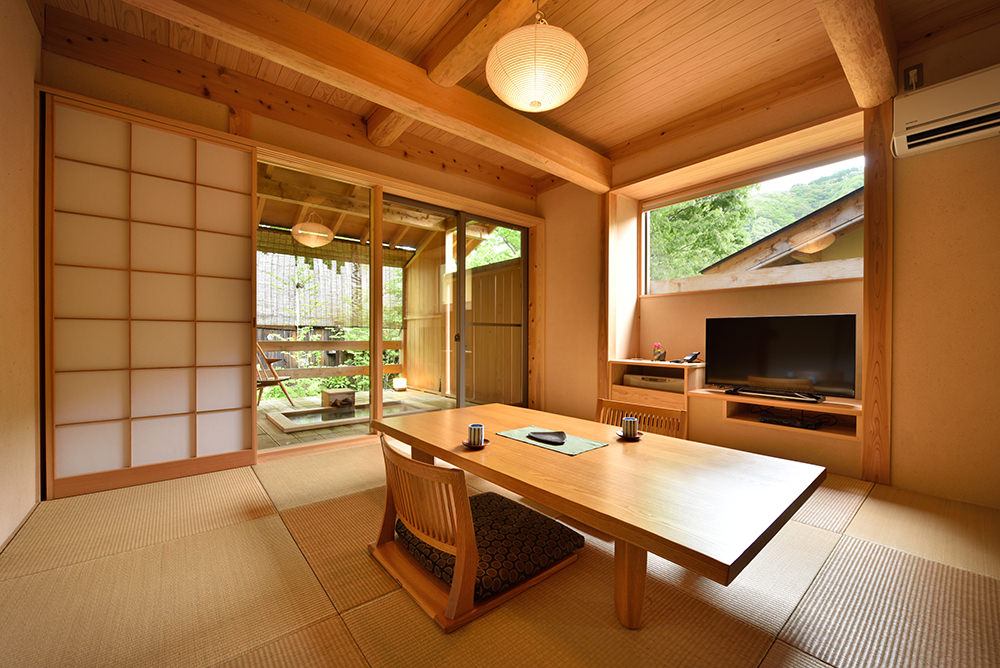 別荘のような寛ぎと開放感 専用の天然温泉露天風呂と、お楽にお休みいただけるベッドルーム付きの客室です。やわらかで温かな室内の木の設えとともに、大きく明るい窓からの四季の庭の眺めをお楽しみください。意匠はそれぞれに異なり、間取りは殆ど同じタイプで3室がございますが、お泊まりいただくお部屋は当館にお任せいただきます。